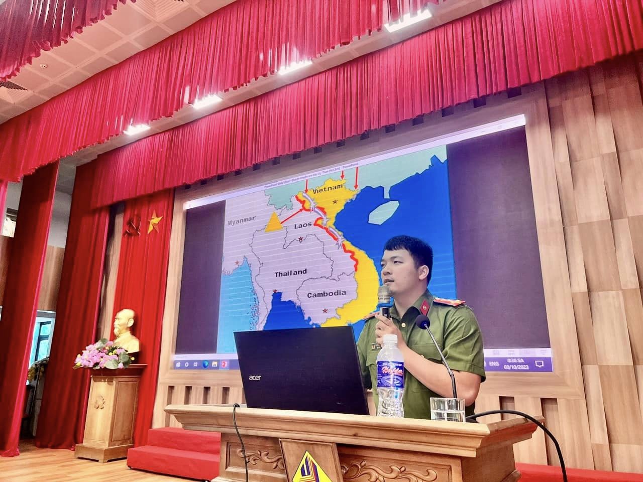 Đồng chí Trương Duy Phong - Cán bộ tuyên truyền thuộc Phòng cảnh sát điều tra tội phạm ma túy Công an tỉnh Quảng Ninh trực tiếp tuyên truyền.